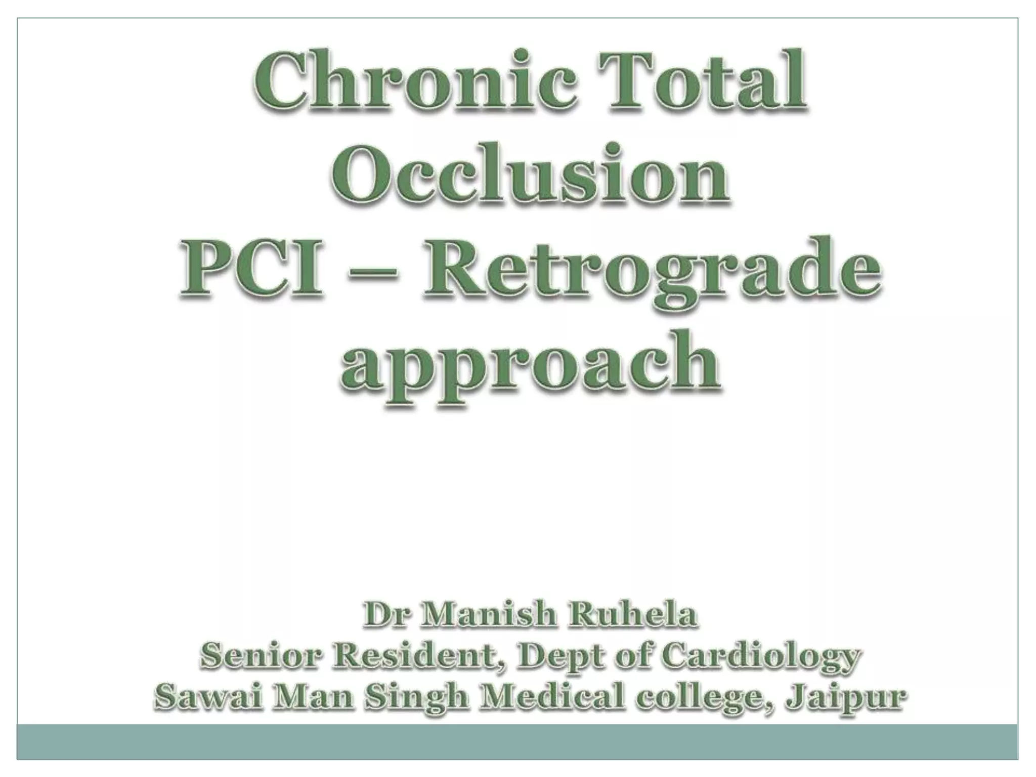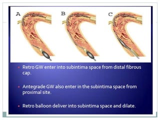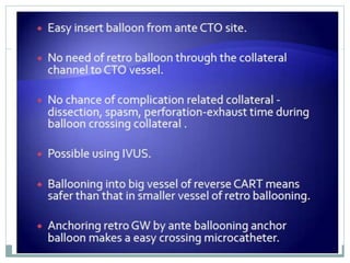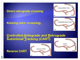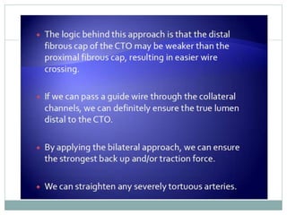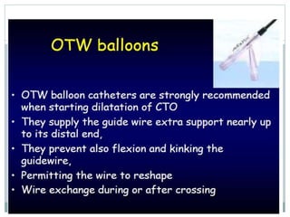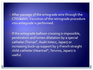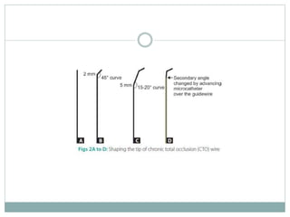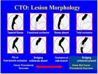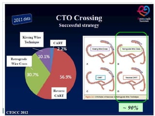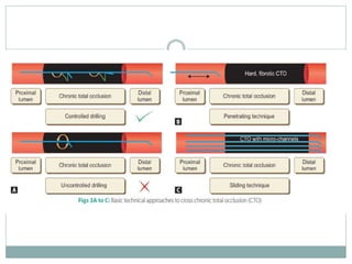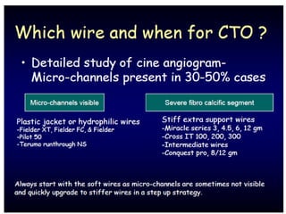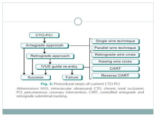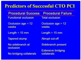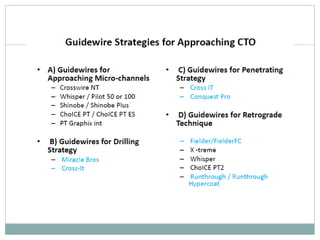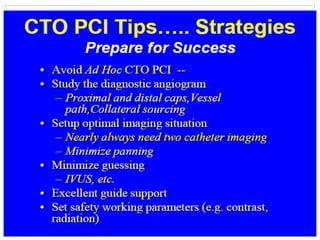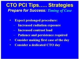 The document discusses strategies for percutaneous coronary intervention (PCI) of chronic total occlusions (CTOs). It describes: