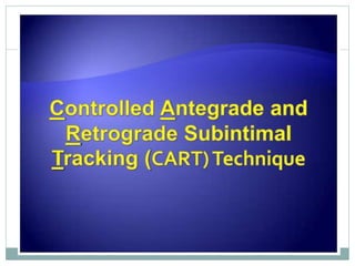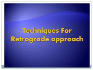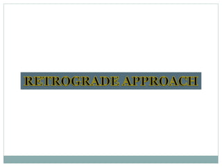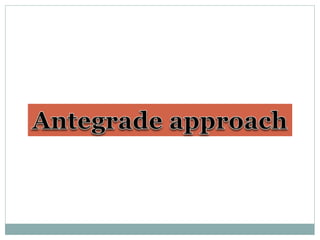 1. The antegrade approach is the most commonly used, with success rates of 60-80%. Tapered guidewires are first-choice to probe microchannels.