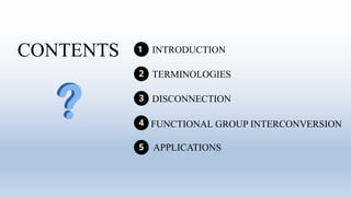 This document provides an introduction to retrosynthesis, which involves working backwards from a target molecule to devise a synthetic route. It discusses key terminology like disconnections, synthons, and functional group interconversions. The principles of retrosynthesis are disconnection, where an imaginary bond cleavage corresponds to a synthetic reaction, and functional group interconversion, which involves changing one functional group to another. Examples of retrosynthesis are provided for drugs like ofornine and paracetamol to illustrate these concepts.