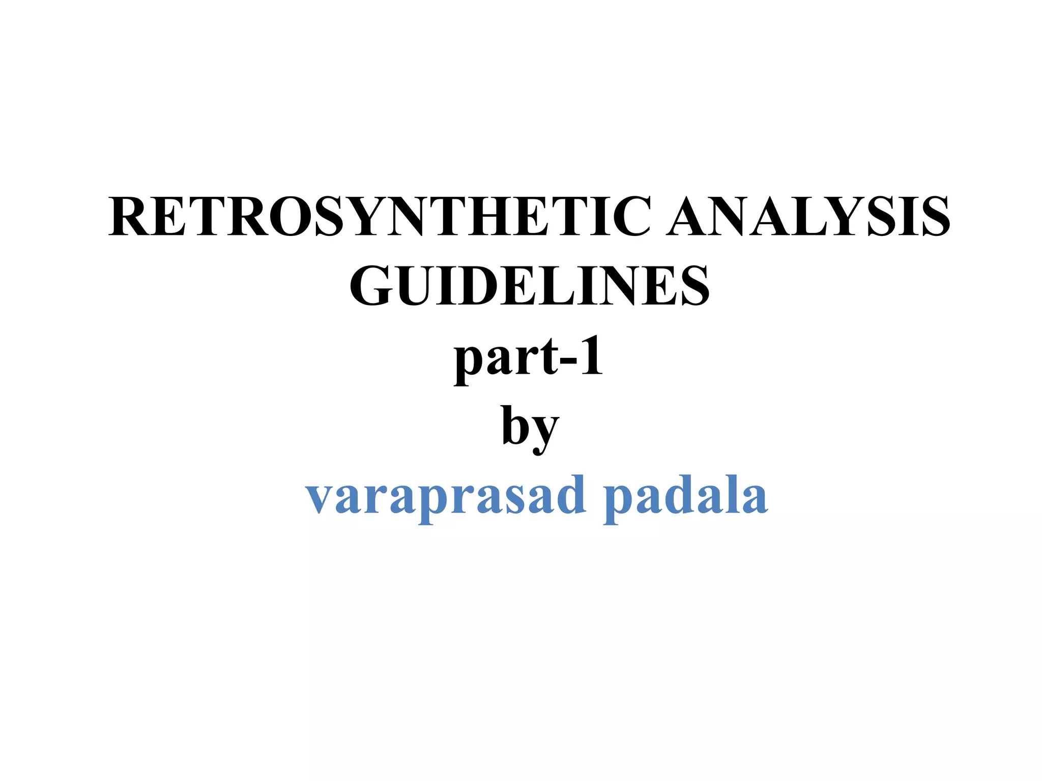 Retrosynthetic analysis breaks down a complex target molecule into simpler structures along a pathway, ultimately leading to identification of a commercially available starting material. This technique plans a synthesis in reverse by reducing the target into progressively less complex structures. Guidelines provide general rules and advice for conducting retrosynthetic analysis, such as examples.
