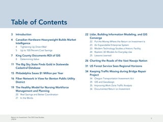 This document discusses ten case studies showcasing the return on investment (ROI) of Geographic Information System (GIS) technology across various organizations and sectors. It highlights how GIS has led to significant cost savings and improved efficiency in areas such as direct mail marketing for businesses like Rona, and enhanced public service delivery in King County, Washington, where the GIS program generated substantial net benefits over an 18-year span. The document emphasizes the importance of evaluating ROI to justify expenditures and improve organizational effectiveness in both public and private sectors.