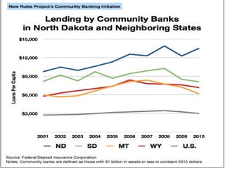 The document discusses the need for state-owned banks as a viable alternative for addressing financial issues faced by states and municipalities, suggesting that investing in public banking can free up funds for local needs and services. It presents the successful model of the Bank of North Dakota, which has shown positive outcomes such as low unemployment, budget surpluses, and economic growth. The document calls for advocacy and action to establish similar public banking systems in other states, emphasizing the importance of keeping tax revenues within local communities.