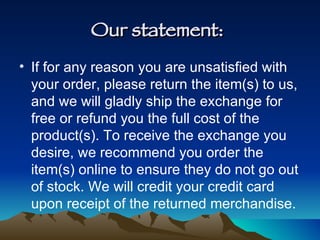 - The document outlines Backcountry.com's refund and exchange policy, explaining that customers can return items for a refund or exchange and that exchanges are preferred to keep money within the company.