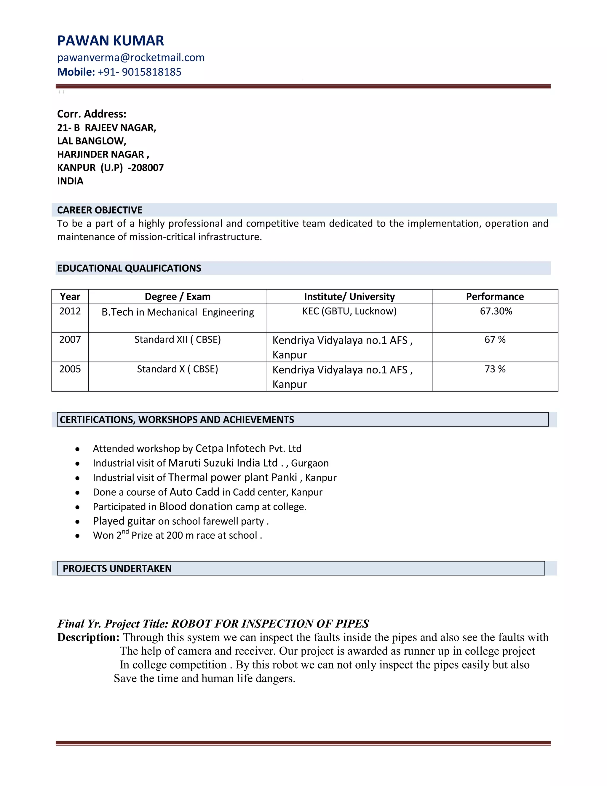 Pawan Kumar is seeking a position in a professional and competitive team dedicated to infrastructure. He has a B.Tech in Mechanical Engineering from KEC in 2012. His educational qualifications also include high school exams from Kendriya Vidyalaya no.1 AFS in Kanpur. He has certifications and workshops in areas like AutoCAD and has done industrial visits and summer training at companies like Hindustan Aeronautics and Scooters India. His hobbies include playing guitar, writing, and listening to music. He completed a final year project on a robot for inspecting pipes.