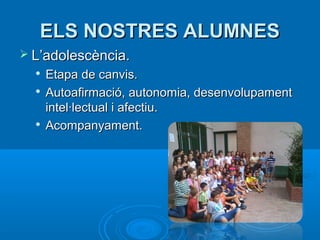 #3 Etapa de canvis: d’infàcia a pre-adolescència. Autoafirmació: contradicció amb els mestres i pares. Autonomia: que cal respectar i acompanyar. Desenvolupament intel.lectual i afectiu: maduració encaixan aprenentatges de forma global. necessiten el recolçament del grup i dels adults. Sentir-se acceptat - autoestima