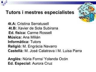 Tutors i mestresespecialistes 4t.A: Cristina Serratusell 4t.B: Xavier de Sola Subirana Ed. física: Carme Rossell Música: Ana Milián Informàtica: Tutors Religió: M. Engràcia Navarro Castellà: M. José Calatrava i M. Luisa Parra Anglès: Núria Forns/ Yolanda Ocón Ed. Especial: Aurora Cruz