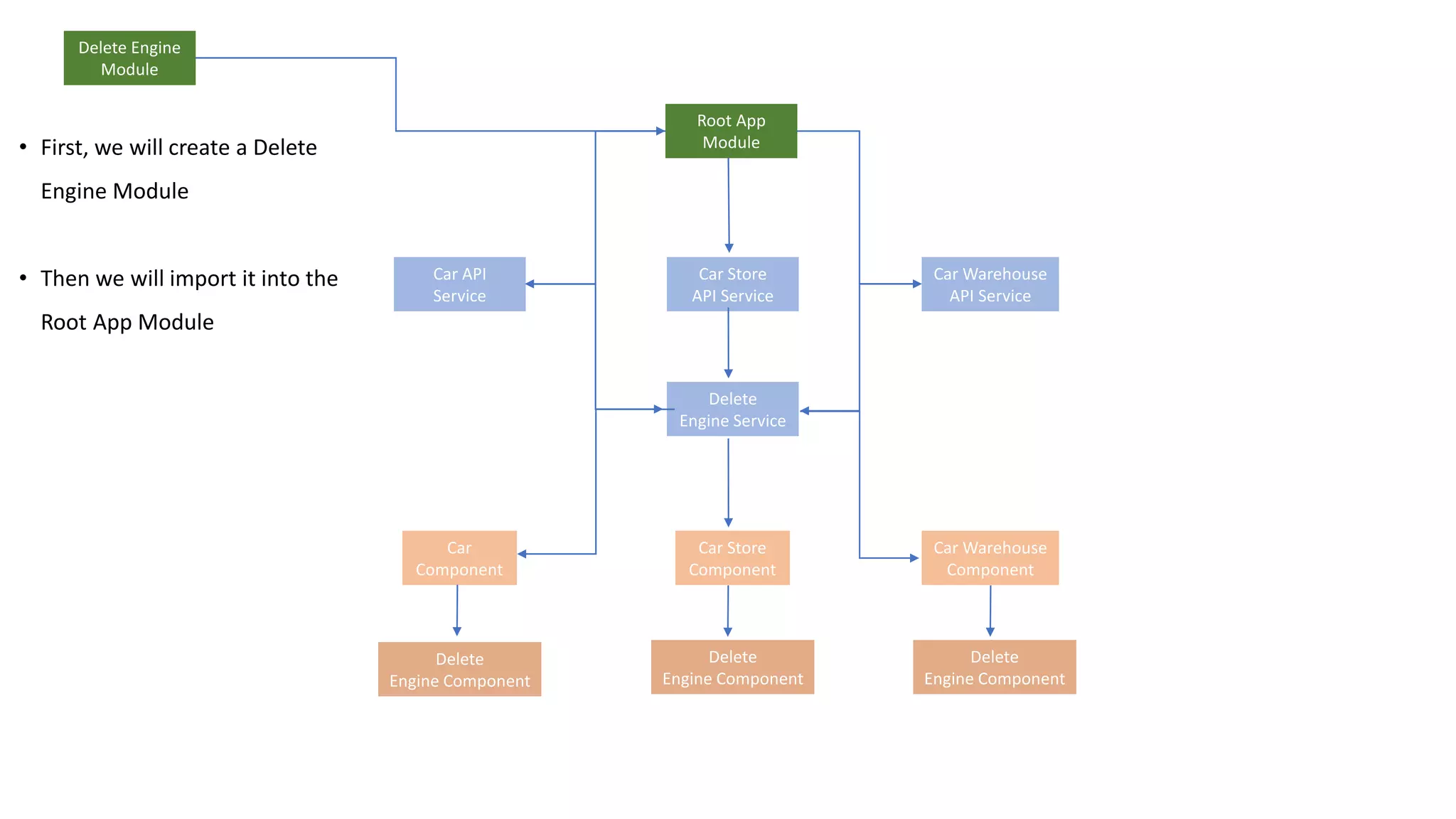 The document outlines the process of creating a delete engine module within an Angular application, detailing the creation of three specific API service classes (car, car store, and car warehouse). It emphasizes the importance of extending these classes to a delete engine service class, which acts as a generic provider for resource deletion across various components. The document concludes by describing how to implement this architecture for better flexibility and reusability in Angular components.
