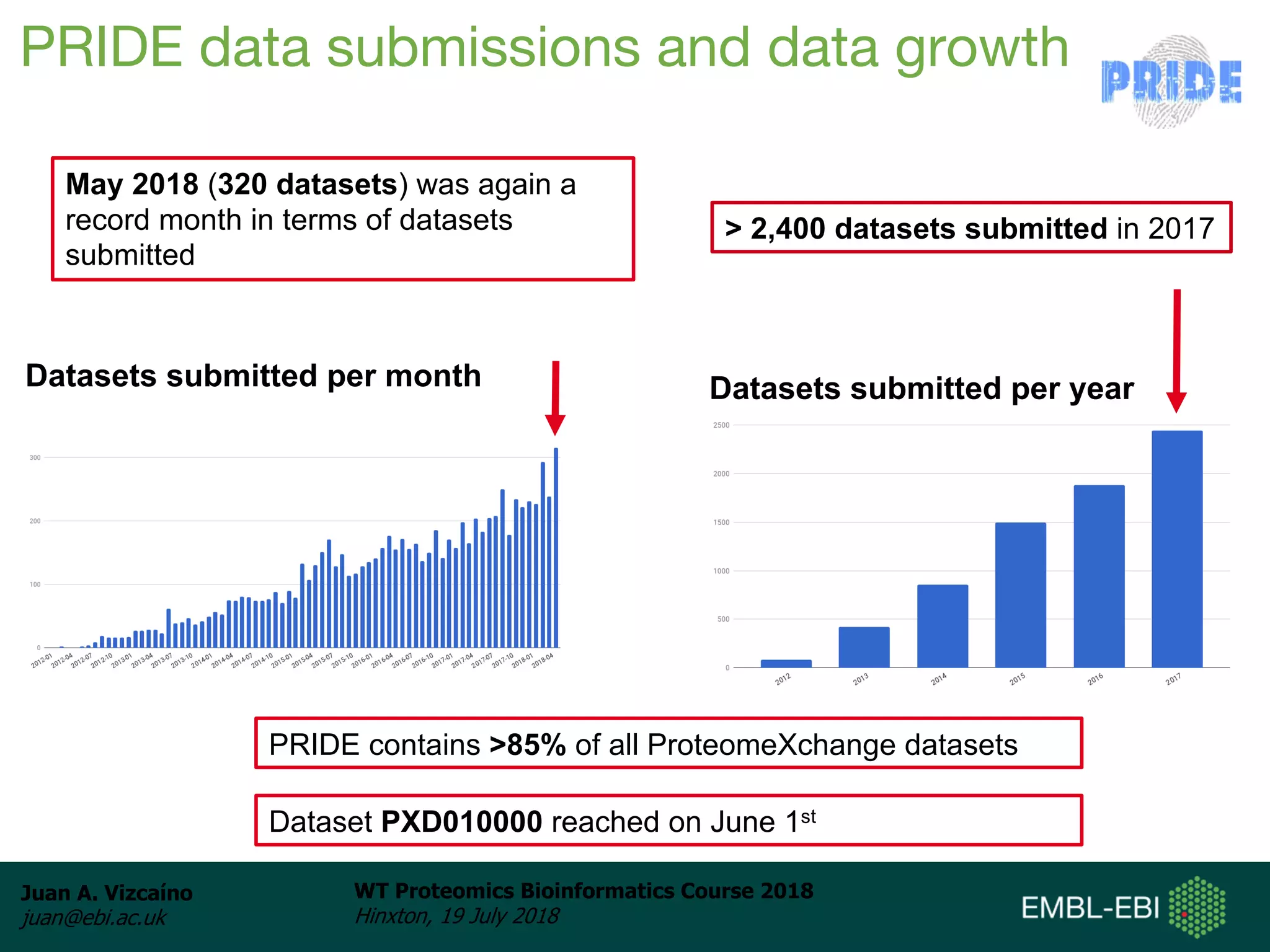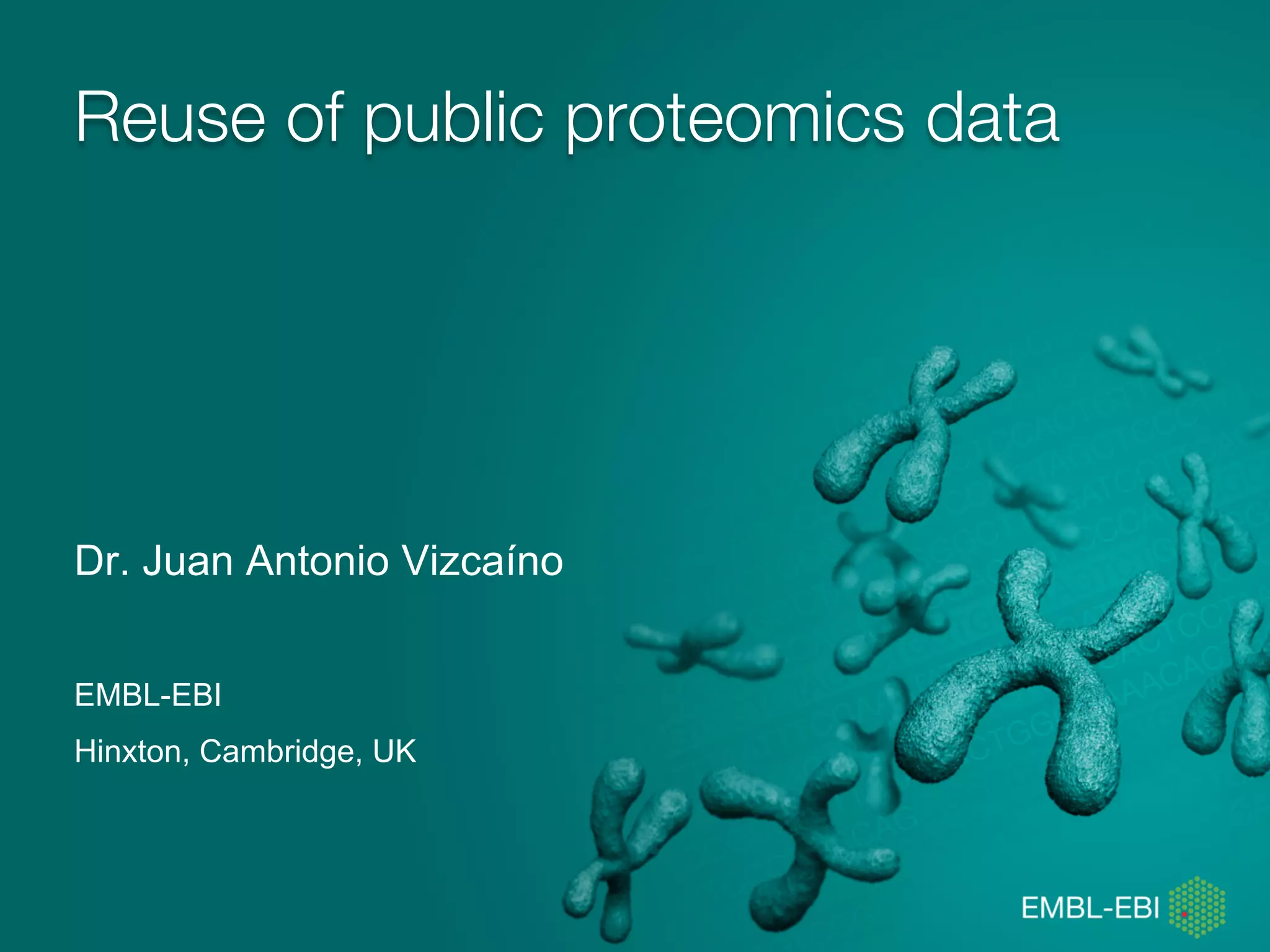 Dr. Juan Antonio Vizcaíno presented on the reuse of public proteomics data. The submission of proteomics datasets to repositories like PRIDE has increased dramatically in recent years. Downloads and reuse of data from PRIDE has also grown significantly, reaching 295 terabytes in 2017. Common ways researchers reuse public proteomics data include verifying published results, building spectral libraries, finding interesting datasets to reanalyze for new discoveries, and benchmarking new algorithms. Data sharing allows information to be extracted and reused in new experiments, advancing protein knowledge in areas like UniProt and neXtProt databases.