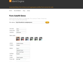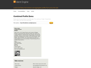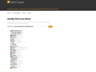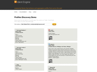 The document discusses the concept of re-using social media data to build and consolidate digital identities across various platforms. It details methods for aggregating profiles through APIs, microformats, and linkages, alongside the challenges of managing fragmented identities and the importance of data formats in this process. Various tools and libraries, including Google’s Social Graph API and microformats parsers, are highlighted for developers to implement identity discovery in their applications.
