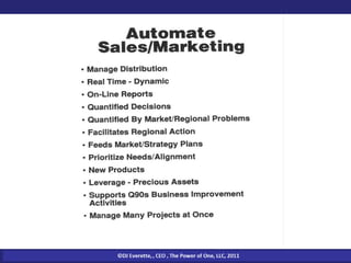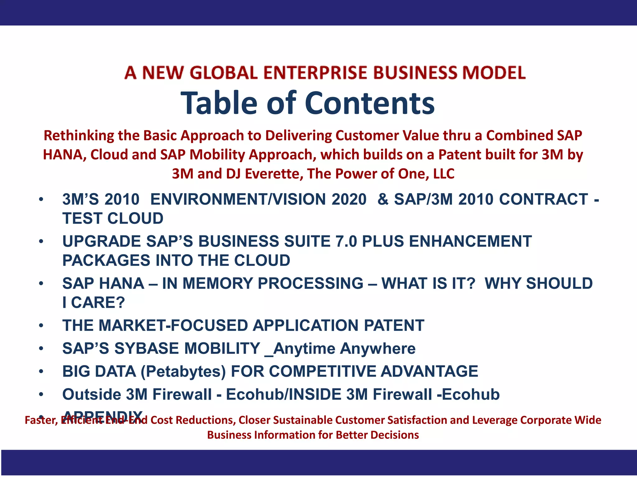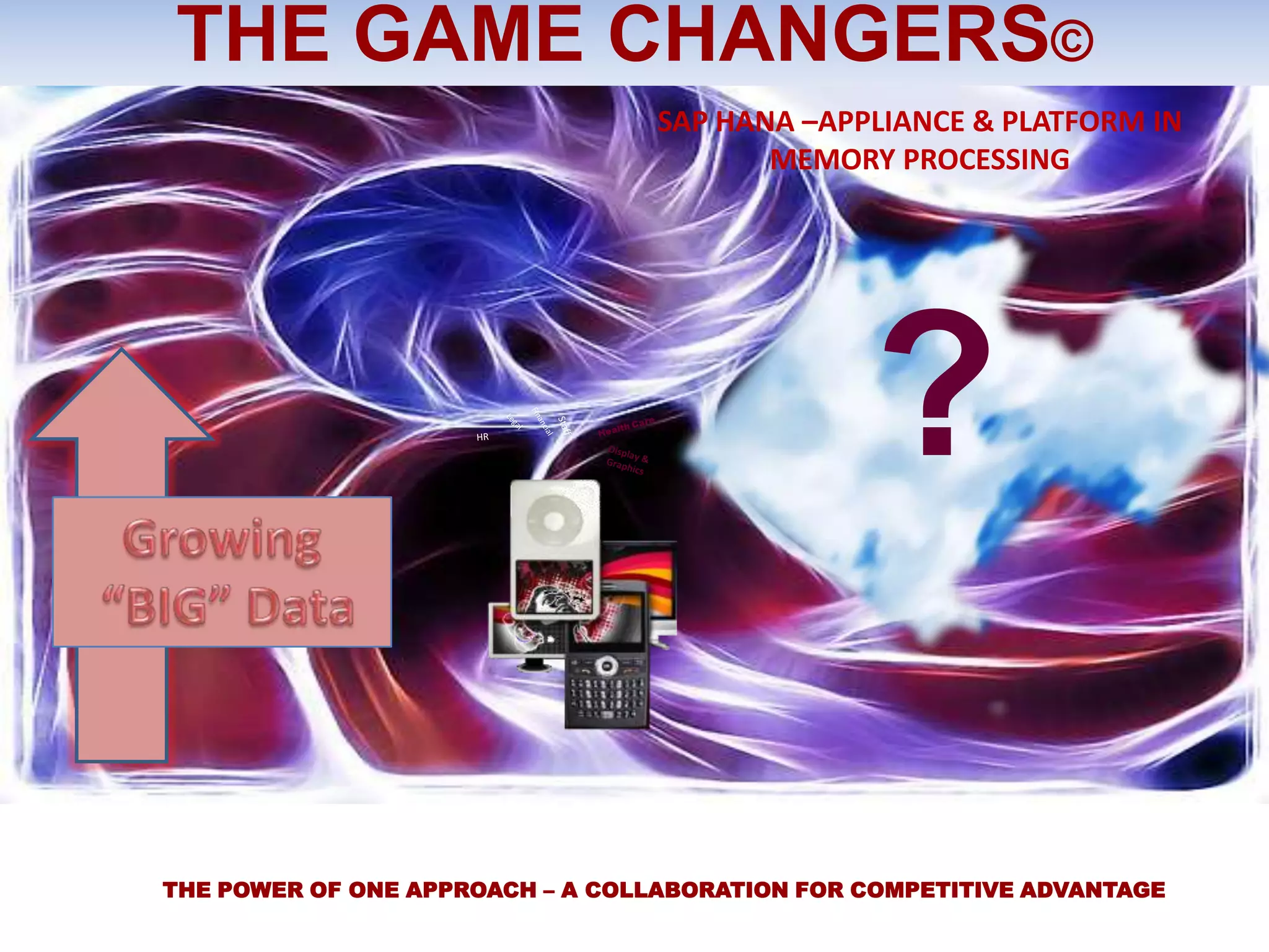 The document discusses SAP HANA in-memory processing technology and how it can be combined with cloud computing and SAP mobility solutions to provide competitive advantages. It proposes a market-focused cloud solution that uses these technologies along with big data and a patented process to create a listening, creative and responsive global enterprise with a single integrated approach focused on the customer. The solution aims to deliver faster and more efficient end-to-end cost reductions, closer customer satisfaction and leverage of business information for better decisions.