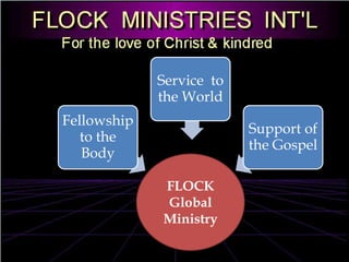 Flock Ministries International, a U.S.-based religious organization, celebrates 21 years of service under the lordship of Jesus Christ, focusing on global missions, community service, and support for ministers. The document outlines various initiatives, including medical missions, youth camps, and disaster relief, to aid underserved communities. It highlights personal anecdotes and experiences from the author's father’s ministry among the Bilaan people, emphasizing a commitment to serve through faith and charity.