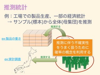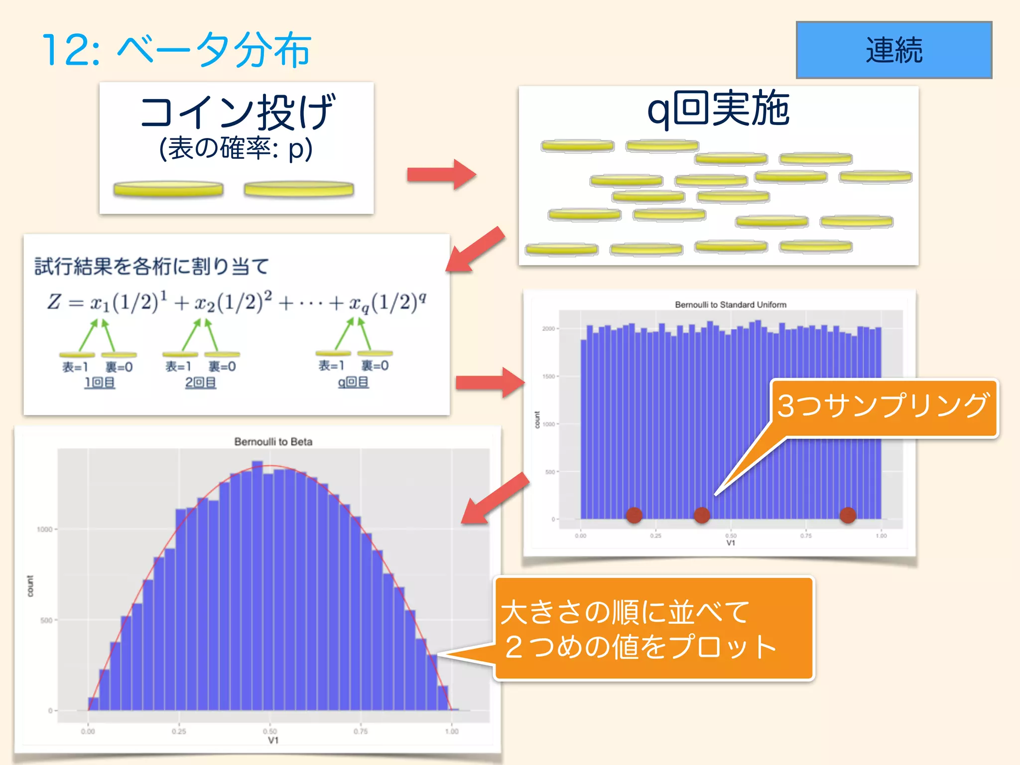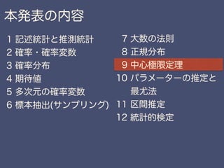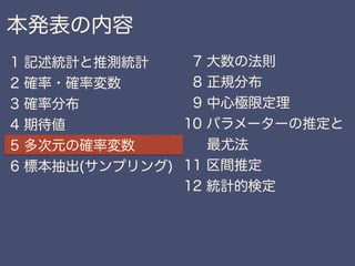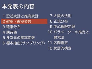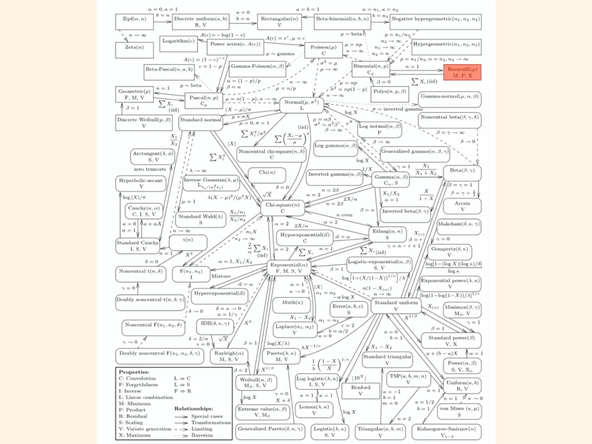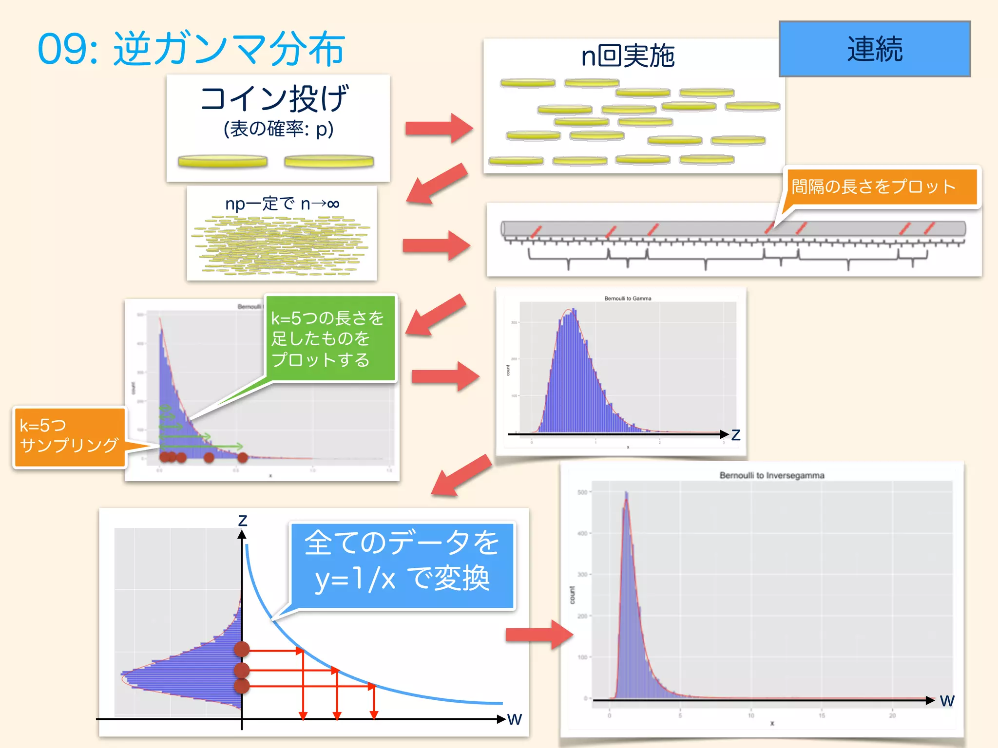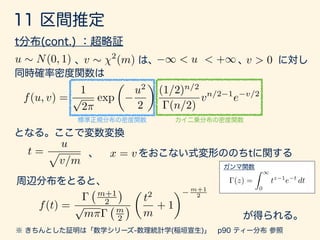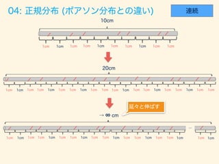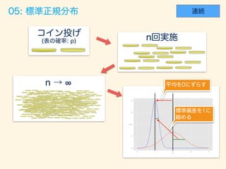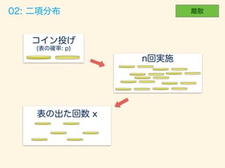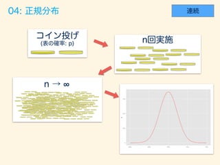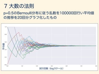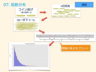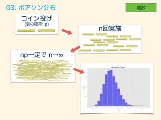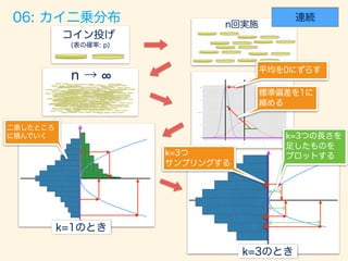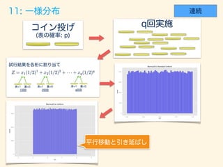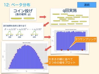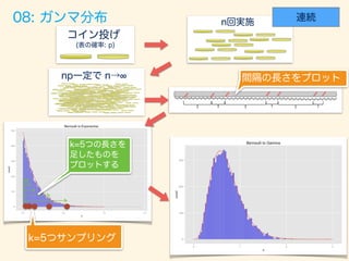 The document describes various probability distributions that can arise from combining Bernoulli random variables. It shows how a binomial distribution emerges from summing Bernoulli random variables, and how Poisson, normal, chi-squared, exponential, gamma, and inverse gamma distributions can approximate the binomial as the number of Bernoulli trials increases. Code examples in R are provided to simulate sampling from these distributions and compare the simulated distributions to their theoretical probability density functions.