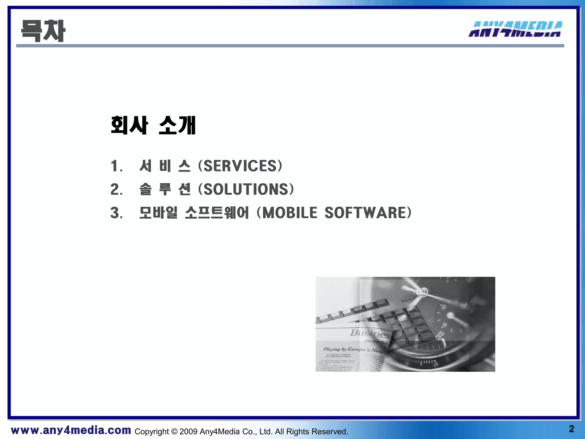 회사 소개 1. 서 비 스 (SERVICES) 2. 솔 루 션 (SOLUTIONS) 3. 모바일 소프트웨어 (MOBILE SOFTWARE) www.any4media.com Copyright © 2009 Any4Media Co., Ltd. All Rights Reserved. 2