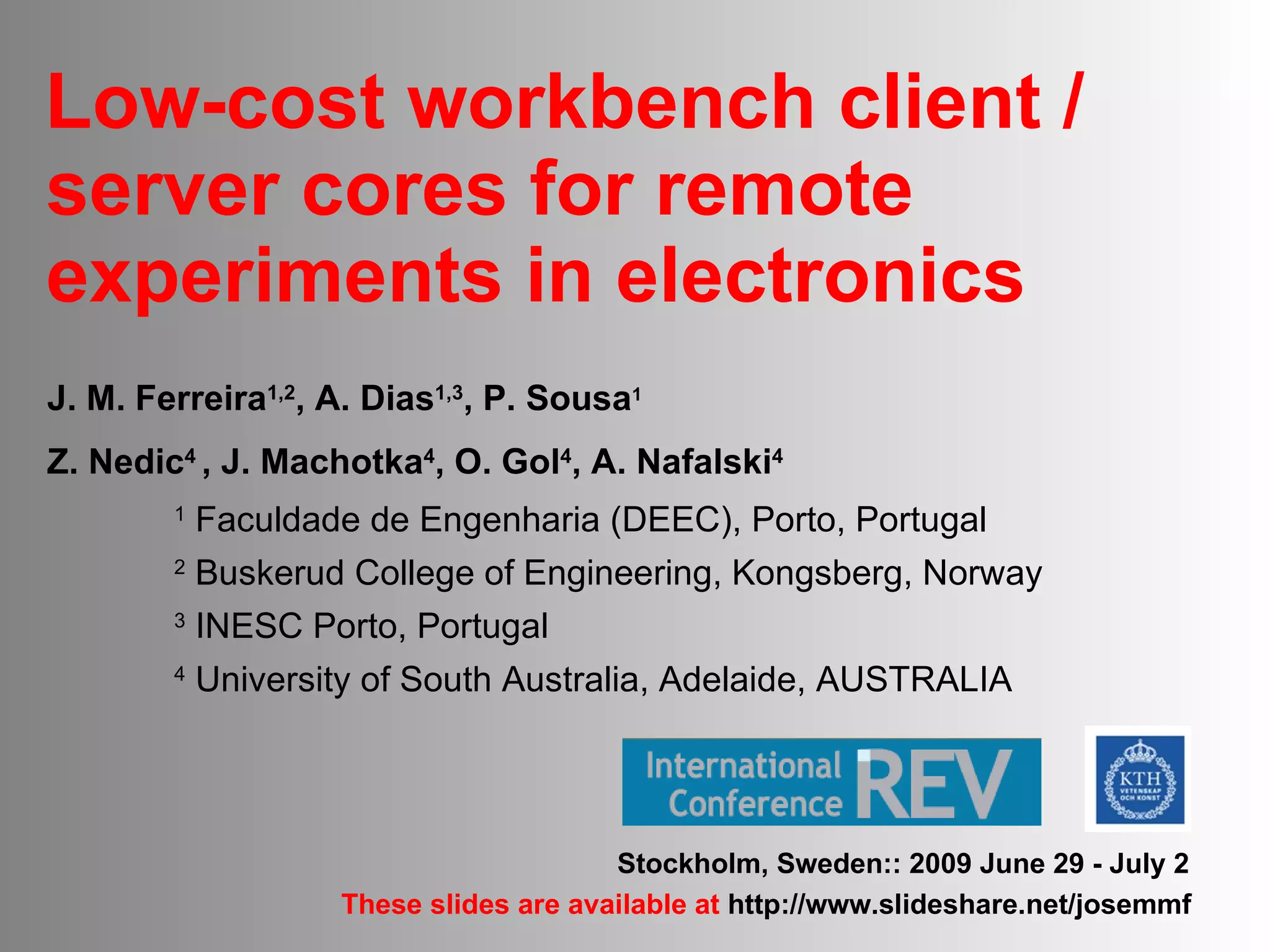 The document discusses the development of low-cost client/server cores for remote experimentation in electronics. It presents two remote workbench designs - a boundary-scan test workbench and a microcontroller workbench. Both workbenches use inexpensive embedded internet modules and open source software to allow remote control and monitoring of experiments over the internet at low cost compared to previous solutions.