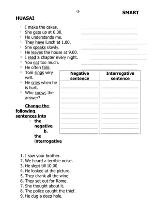 1) The document provides instructions for completing various grammar exercises in past simple tense including circling past simple verbs, filling in blanks with given past simple verbs, changing sentences to past simple, changing sentences to negative and interrogative forms, rewriting ideas as sentences, and completing a story with past simple verbs.