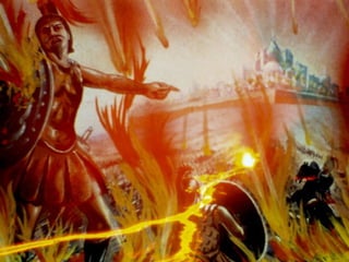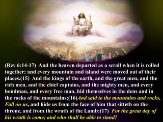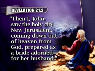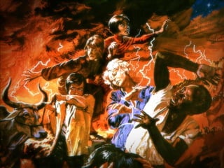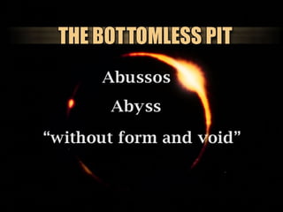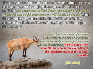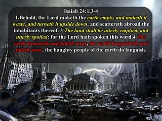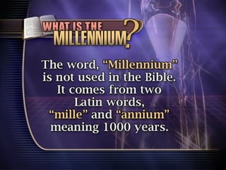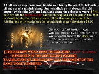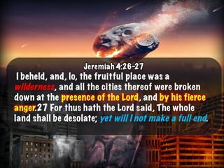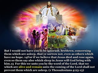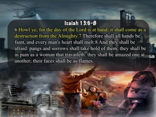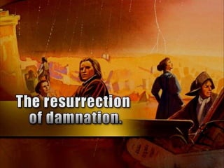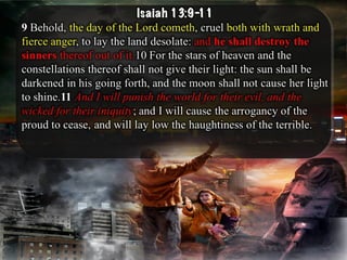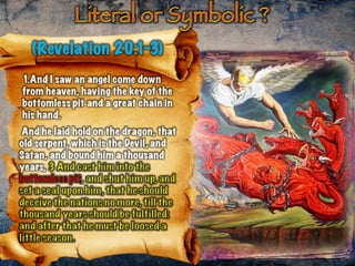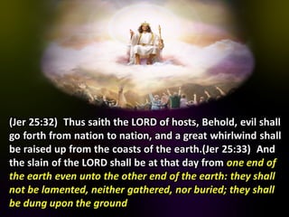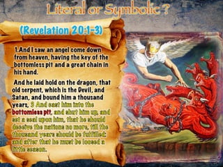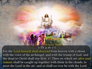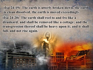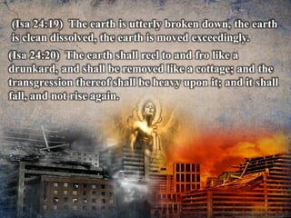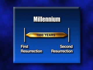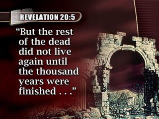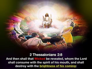 The document discusses the events surrounding the second coming of Christ and the aftermath. It states that when Jesus returns, the wicked will be destroyed while the righteous will be resurrected or translated. As a result of the wicked being destroyed, Satan will be alone on Earth with no one left to tempt. He will then be bound to a desolate Earth for 1,000 years while the righteous reign with Christ in heaven. During this time, the saints will participate in the judgment of the wicked and righteous. After 1,000 years, Satan will be released briefly to go out and deceive the nations again before being defeated by fire from God and cast into the lake of fire along with all the wicked, facing the second