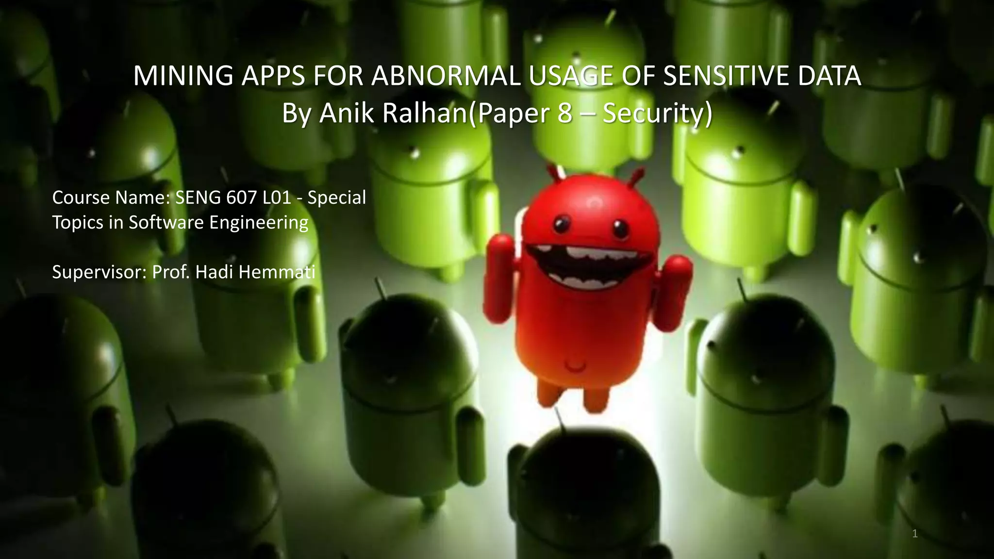 The document discusses a research paper on detecting abnormal usage of sensitive data in mobile applications, focusing on Android APK malware analysis techniques that employ static and dynamic analysis methods like Mudflow and FlowDroid. The method is validated against a dataset of benign and malicious apps, highlighting the challenges of false positives and the need for performance optimization. Suggestions for extensions include improving analysis for varied app sizes and conducting a comparison with commercial tools.