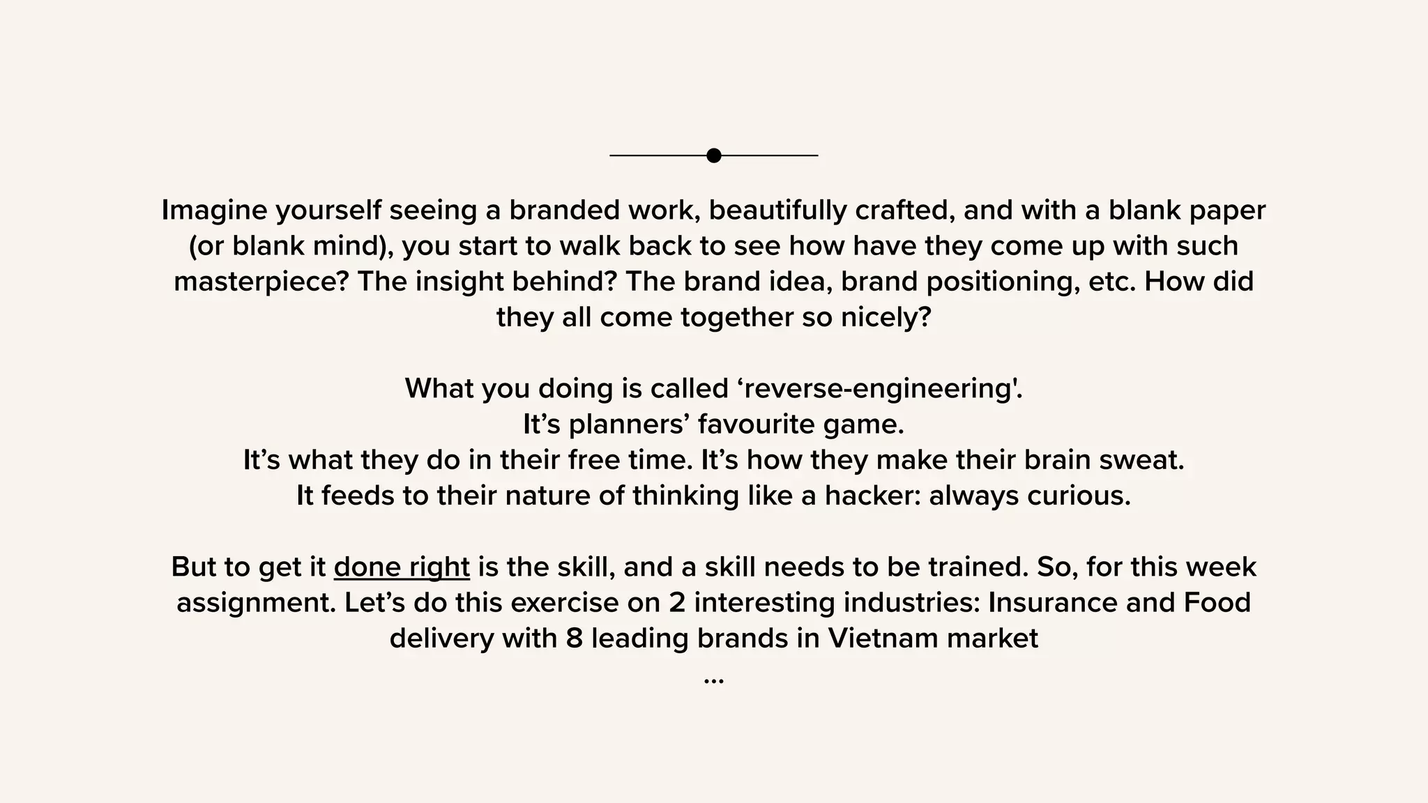 The document discusses reverse engineering brand strategies for 8 insurance and food delivery brands in Vietnam. It provides templates for analyzing a brand's positioning, idea, promise, and communication idea. For each brand component, it gives the definition and key parts to analyze. The document then analyzes the branding strategies of 8 insurance brands (Generali, Manulife, Prudential, FWD) and food delivery brands (Now, GoFood, GrabFood, Baemin) based on the templates provided.
