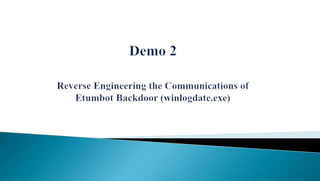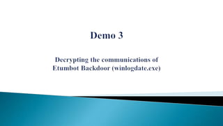 This document provides an overview of the Etumbot malware, including its use in cyber espionage attacks, how it works, and how to analyze and decrypt its communications. Etumbot is dropped via spearphishing emails and establishes persistence on Windows systems by adding a registry entry. It communicates with command and control servers using an initial handshake to receive an RC4 key, which it then uses to encrypt additional communications like sending stolen system information. The document demonstrates analyzing the malware's behavior and decrypting its network traffic.