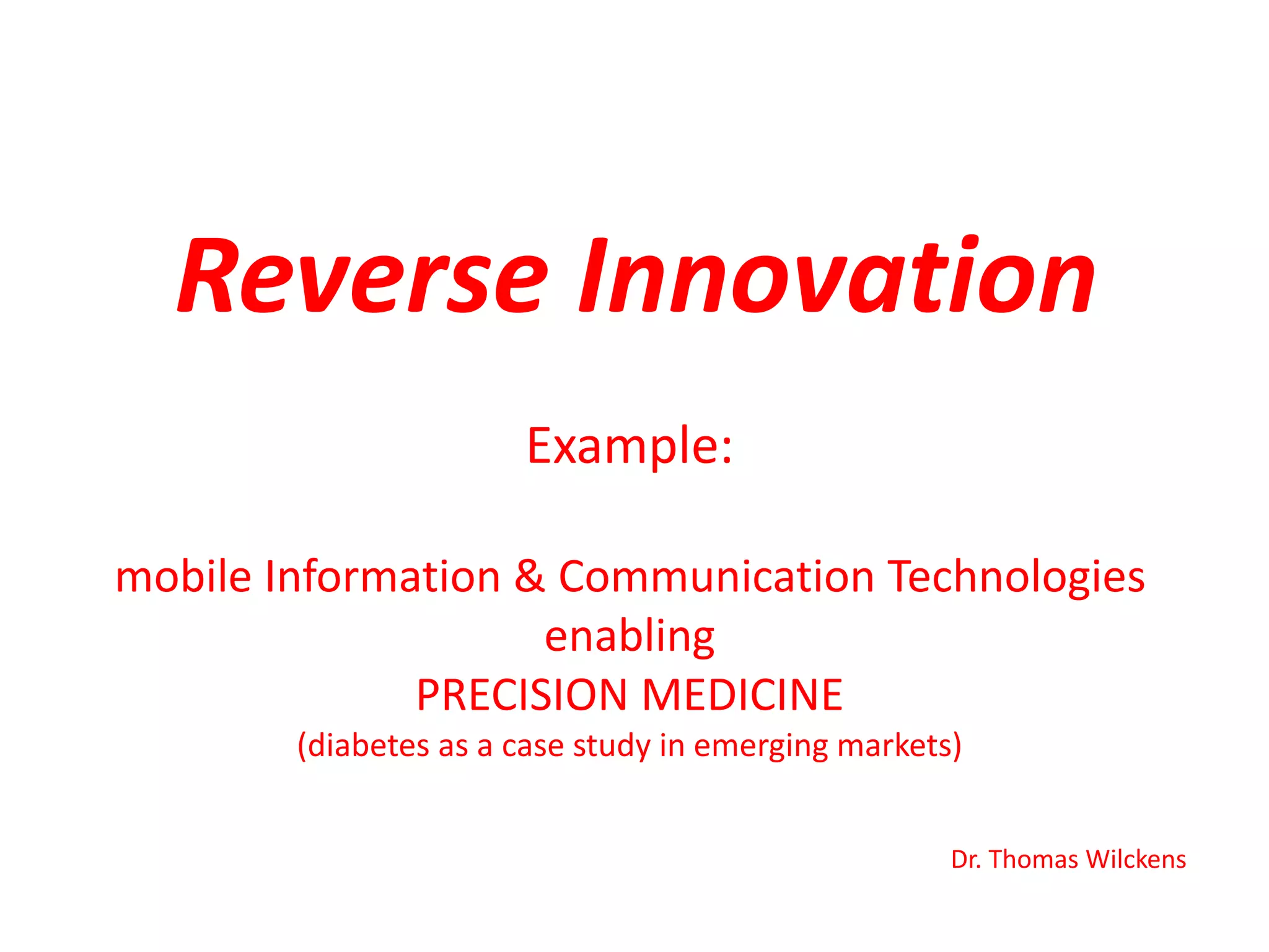 The document discusses the impact of mobile information and communication technologies (ICT) on precision medicine, particularly in diabetes management in emerging markets. It highlights the concept of reverse innovation, where solutions are developed for less regulated regions before being adapted for developed markets, emphasizing the need for affordable and scalable healthcare solutions. The document also addresses challenges and opportunities in diagnostics and treatment, along with predictions for the future of healthcare and patient management systems.