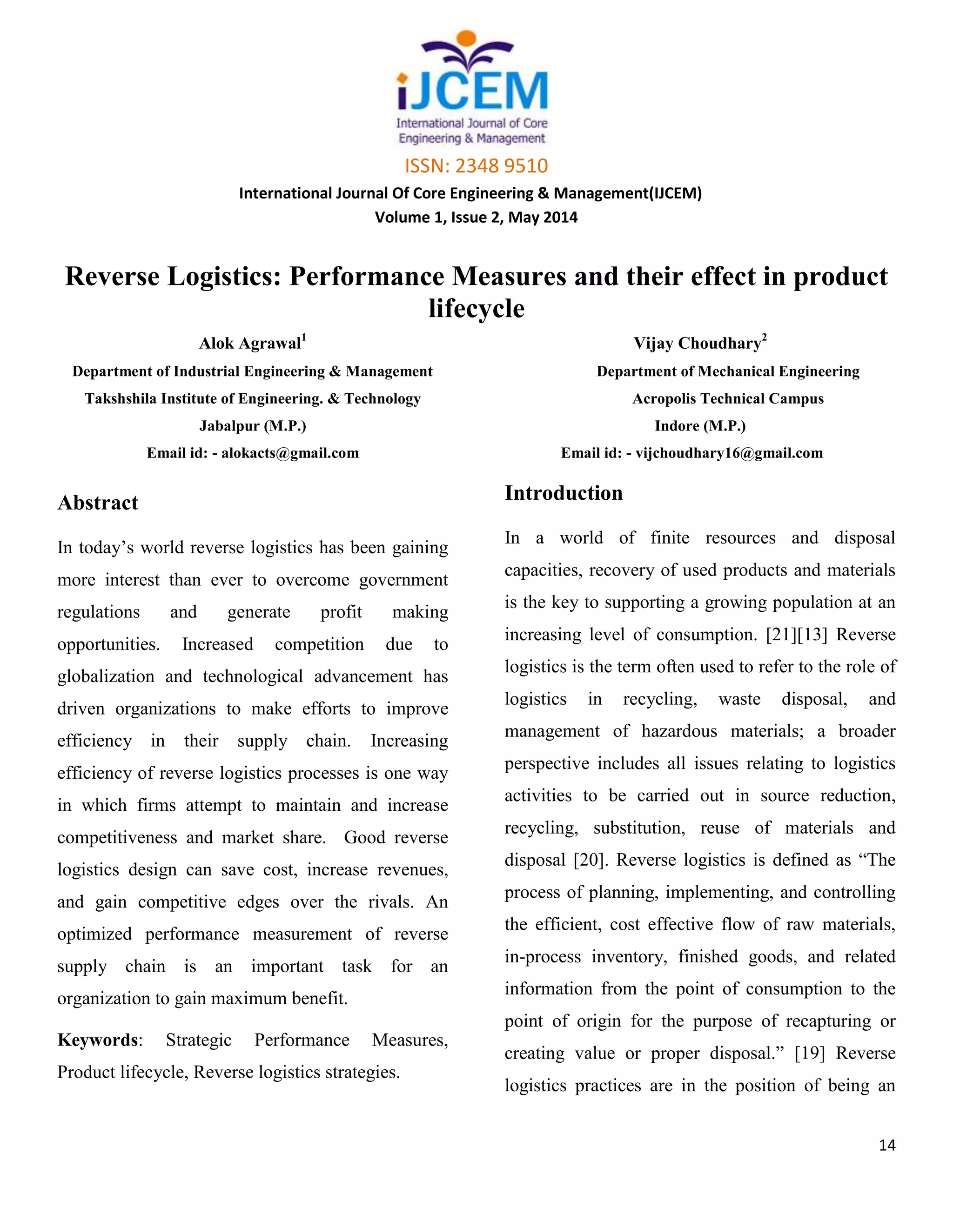 1) The need for performance measurement in reverse logistics to improve operations and gain benefits. It proposes strategic measures from customer, internal process, innovation, and financial perspectives.
