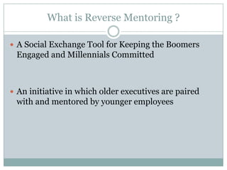 Reverse mentoring is a social exchange tool where older executives are paired with and mentored by younger employees. It helps bridge the gap between baby boomers and millennials by keeping boomers engaged and millennials committed. Reverse mentoring provides benefits to both mentors and mentees. Mentees gain advice on technology and insights into younger generations, while mentors learn about the virtual world and gain a fresh perspective from their mentees. Several case studies show companies using reverse mentoring to foster cross-generational learning and strengthen bonds between different age groups in the workplace.
