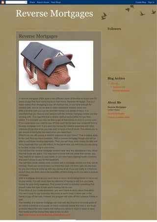 Reverse mortgages allow homeowners over age 62 to convert their home equity into tax-free cash without having to sell their home or make monthly payments. Borrowers can receive the funds as a lump sum, line of credit, or monthly payments. This can help pay medical bills, supplement retirement income, and avoid forced relocation later in life. While closing costs are involved, some lenders roll them into the loan balance. The loan does not need to be repaid as long as the borrower lives in the home as their primary residence.