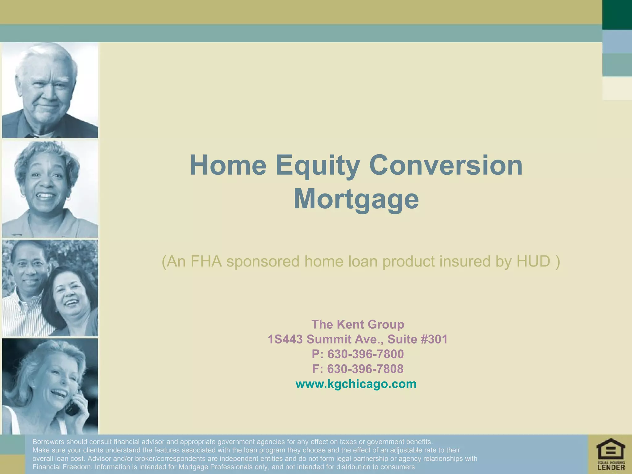 The document provides information about a Home Equity Conversion Mortgage (HECM), also known as a reverse mortgage, which allows senior homeowners to convert home equity into tax-free cash without having to make monthly mortgage payments or repay the loan until they permanently move out of the home. Key details include how the loan amount is calculated based on home value, interest rates, flexible payment options, qualifications, and the application process.