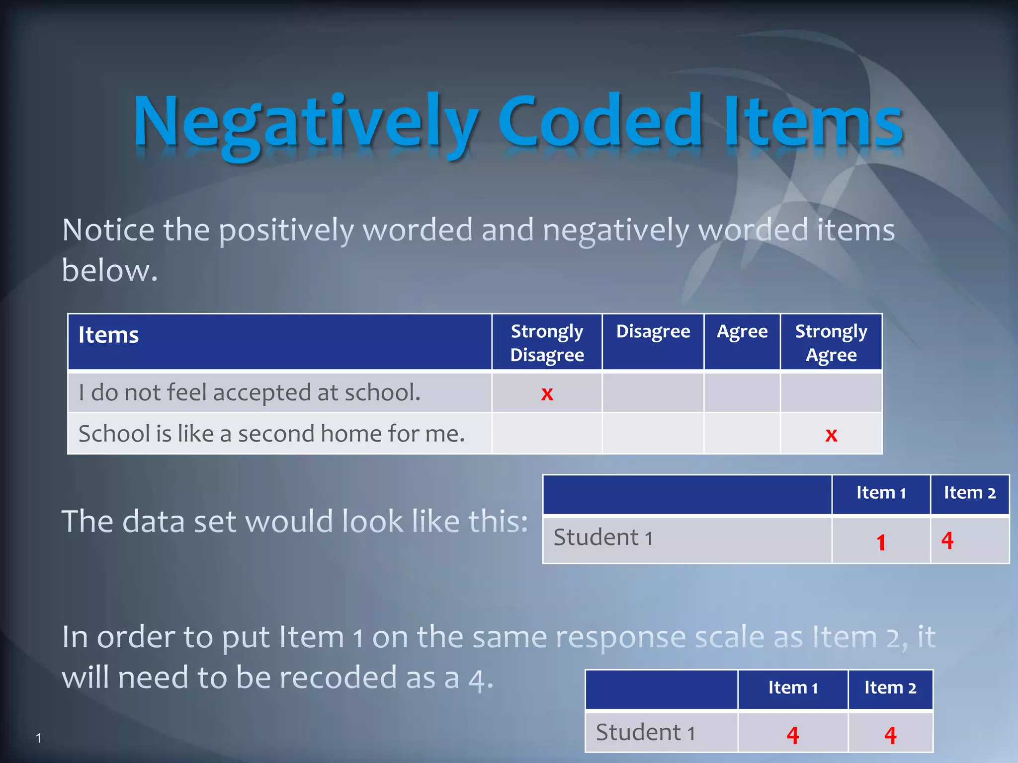 This document contains survey responses from two students to two negatively coded items about feeling accepted at school and whether school feels like a second home. Student 1 disagreed with feeling accepted at school but agreed that school feels like a second home, while Student 2 strongly disagreed with feeling accepted but agreed that school feels like a second home.