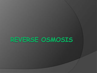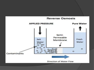 Reverse osmosis is the process of water moving from low to high concentration through a semi-permeable membrane, mainly used for wastewater treatment. By applying pressure on the salt side, water is forced through the membrane, leaving dissolved salts behind. It effectively removes over 99% of dissolved salts and bacteria, making it useful for desalination and industrial applications.