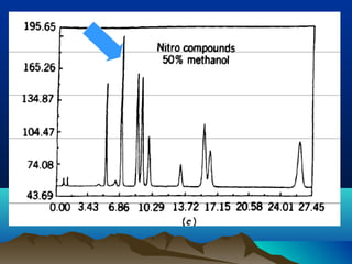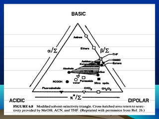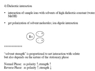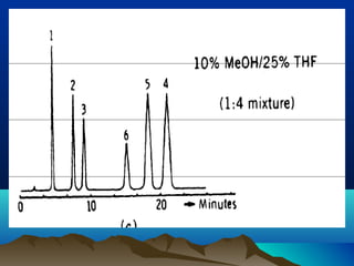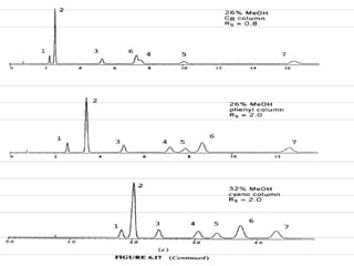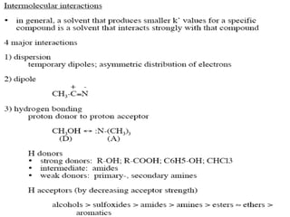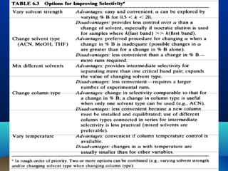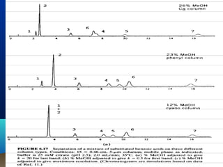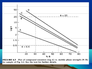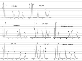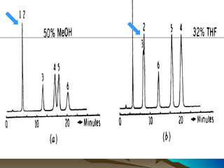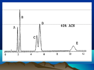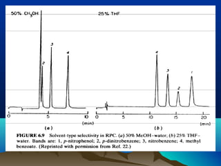 This document discusses reverse phase chromatography and factors that influence analyte retention times. It explains that analytes partition between the mobile and stationary phases, with more hydrophobic compounds retaining longer. Retention time is influenced by properties of both the analyte and experimental conditions like the mobile phase composition, column type, and temperature. Changing the mobile phase from more polar to less polar solvents decreases retention times.