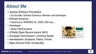 The document discusses Apache httpd v2.4 and its use as a reverse proxy. Key points include: Apache httpd v2.4 has improvements that make it suitable for cloud environments and dynamic configurations; it supports load balancing, clustering, caching, and offloading SSL to improve performance and high availability when used as a reverse proxy; directives like ProxyPass and ProxyPassReverse are used to configure proxying and load balancing using modules like mod_proxy and mod_proxy_balancer.