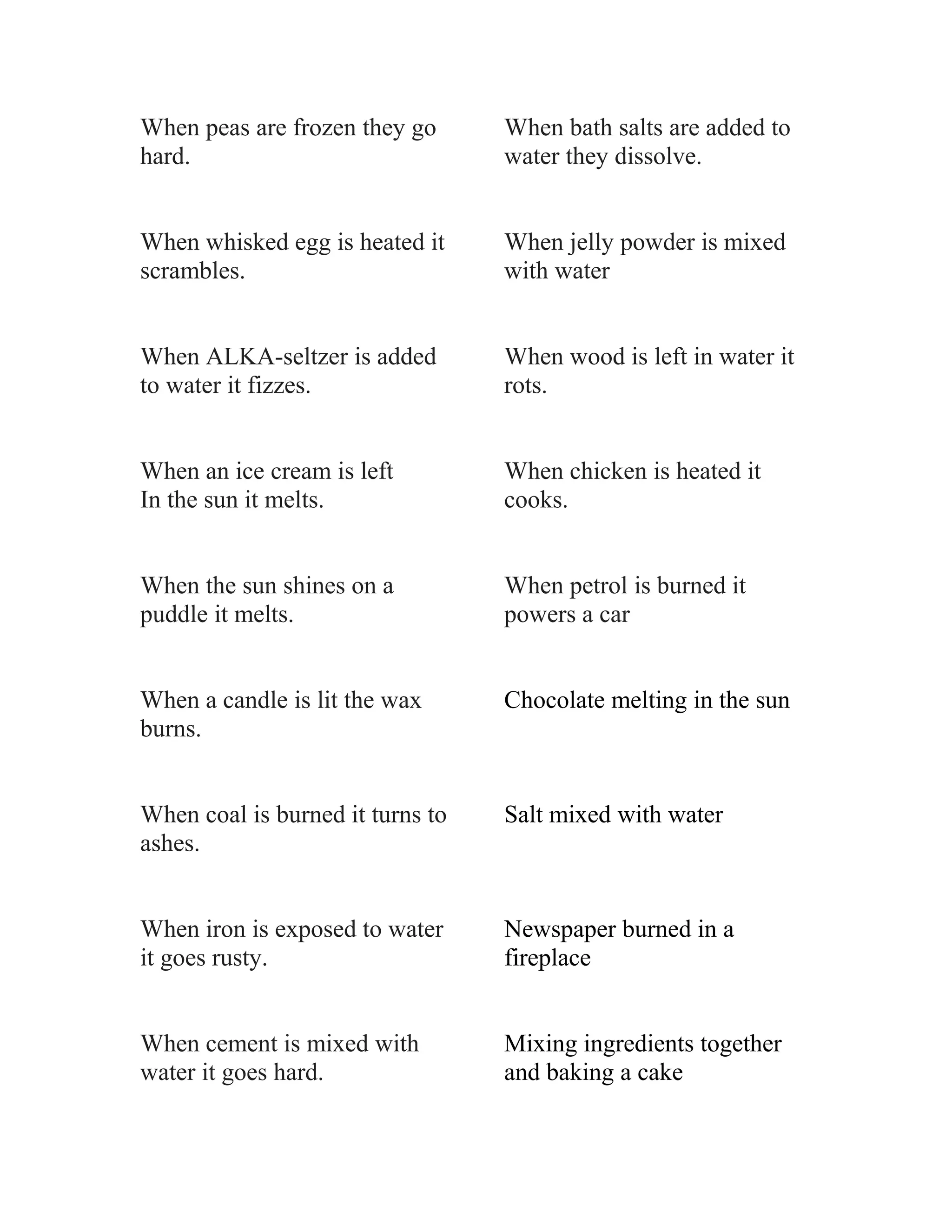The document describes various chemical and physical changes that occur when different substances interact or are exposed to different conditions. Some examples provided include peas freezing hard, whisked eggs scrambling when heated, ALKA-seltzer fizzing when added to water, ice cream melting in the sun, wax burning when a candle is lit, coal turning to ashes when burned, and iron rusting when exposed to water.