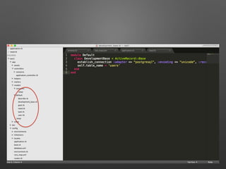 The document discusses reverse engineering Rails models, including the process and tools such as the rare_map and commands for generating models. It highlights advantages such as easier migration from other languages to Ruby on Rails, simplicity in model generation, and the consistency of machine-generated code. The document also outlines steps for creating databases and tables using ER diagrams.