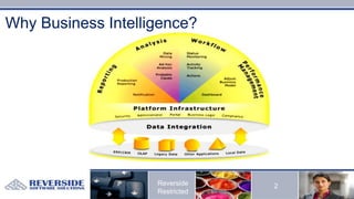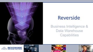 The document outlines the business intelligence (BI) and data warehousing (DW) capabilities of Reverside, detailing specific services offered, including BI architecture design, data modeling, and analytical reporting. It includes case studies of notable clients such as the South African Reserve Bank and Patheon, highlighting the challenges faced and solutions implemented, such as the use of Oracle and Hyperion products. Additionally, it provides contact information for further inquiries regarding their services.