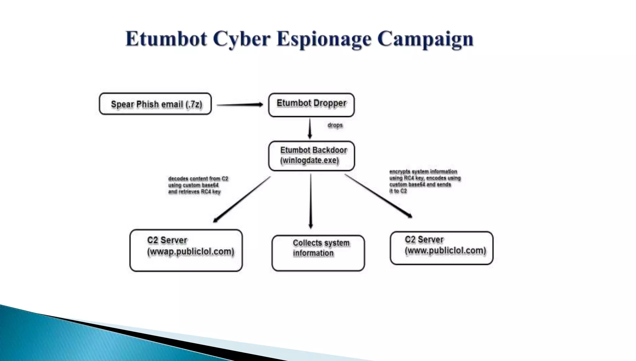 The document provides insights into the Etumbot malware, detailing its operation, communication patterns, and reverse engineering techniques. It emphasizes the responsibilities of the author, who is an information security investigator, and includes multiple references for further understanding of the malware's impact on targeted attacks. The author also outlines methods for decrypting and analyzing the malware's communications with command and control servers.