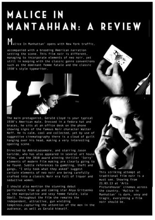 Little White Lies is a British independent film magazine published monthly in London since 2005. Each issue features a cover illustration of an independent or art house film. The magazine focuses on reviews of both current and classic independent and niche films, aiming its content at an audience with a keen interest in film who understand cinema conventions and genres. The submitted document proposes that the magazine would be a good fit to feature the film noir "Malice in Manhattan" due to its focus on independent and niche films similar to the submitted film.