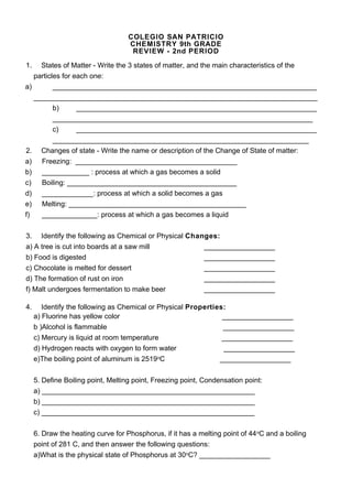 1) The three states of matter (solid, liquid, gas) and their particle characteristics.