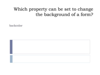 This document appears to be a review quiz for chapters 1-3 of a Visual Basic textbook. It contains multiple choice and true/false questions about Visual Basic concepts like setting form properties, creating Windows programs, using controls and events, and Visual Basic menus and features like IntelliSense.