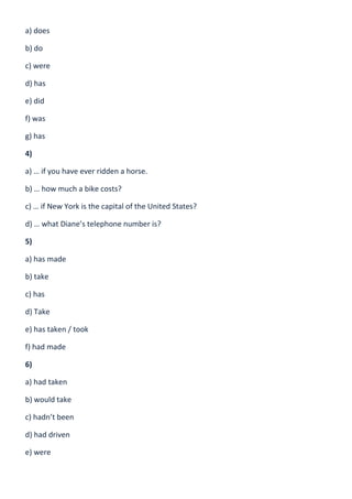 This document provides a review for a midterm test covering units 1, 2, and 3. It contains 6 practice questions testing various English verb tenses and structures. The questions cover simple present, present perfect, simple past, and modal verbs. An answer key is provided to check responses to the questions.