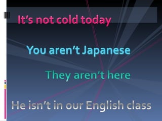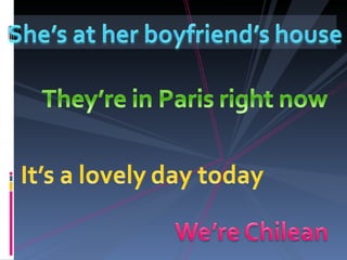 The document provides information on verb conjugations for the present and past tenses in English. It discusses the verb "to be" and its forms for affirmative, negative, and interrogative sentences. It also covers regular verb conjugations in the present and past tenses, the use of adverbs of frequency, object pronouns, and places found in a neighborhood.