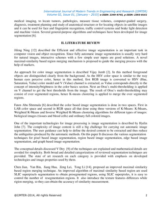 The document reviews various image segmentation techniques, focusing on region-based methods such as seeded region growing and maximal similarity based region merging. It highlights the challenges of automatic image segmentation, particularly for natural images, and discusses the need for interactive methods that utilize user inputs. Applications of image segmentation span across fields like medical imaging, remote sensing, and object recognition, showcasing its importance in extracting meaningful information from images.