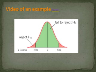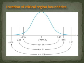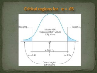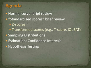 This document provides an overview of key concepts related to the normal distribution, sampling distributions, estimation, and hypothesis testing. It defines important terms like the normal curve, z-scores, sampling distributions, point and interval estimates, and the steps of hypothesis testing including stating hypotheses, collecting data, and determining whether to reject the null hypothesis. It also reviews concepts like the central limit theorem, standard error, bias, confidence intervals, types of errors in hypothesis testing, and factors that influence test statistics.