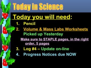1. The document provides instructions for a science class, listing the materials needed for labs on volume and mass.