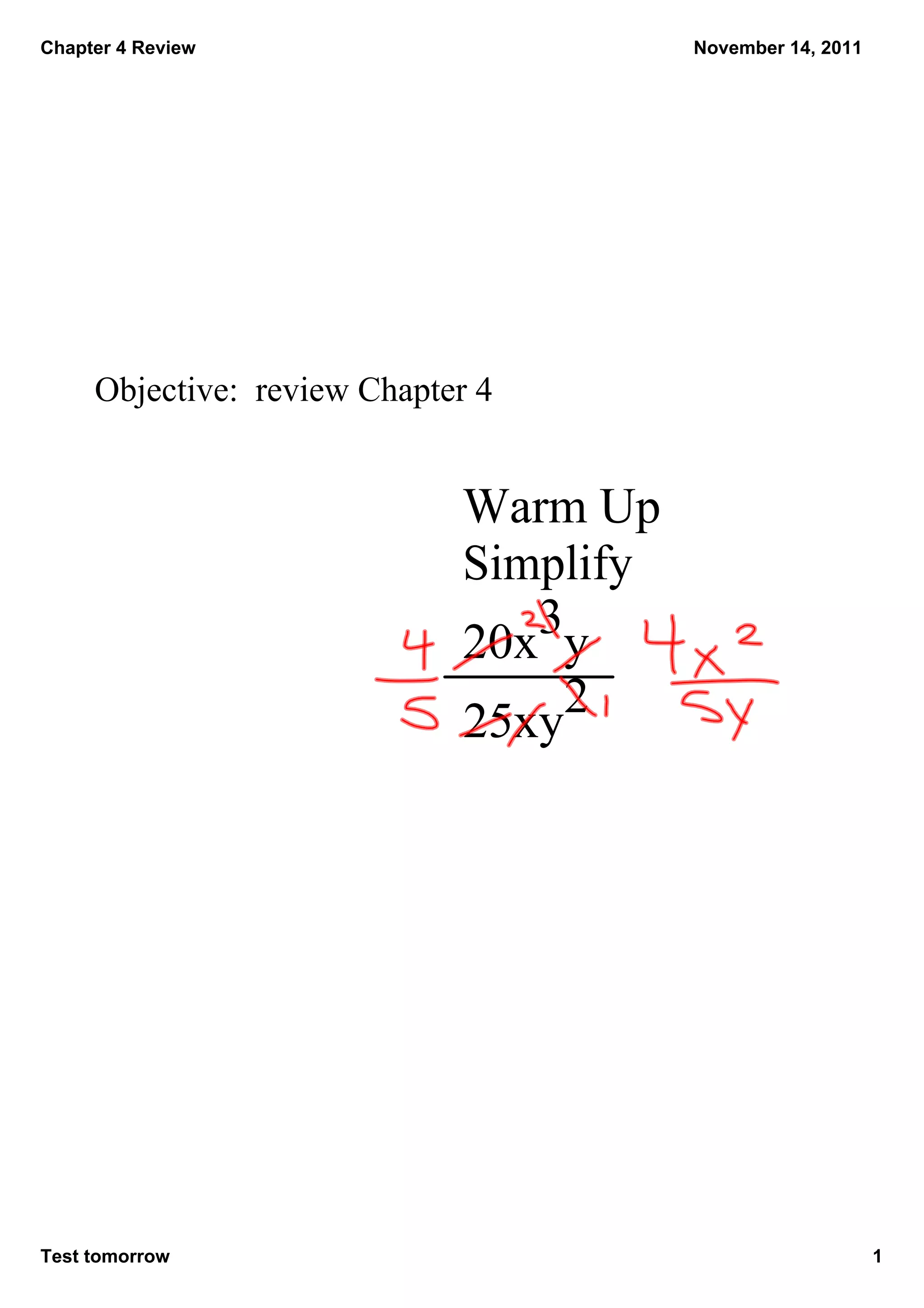 This document contains a review of topics covered in Chapter 4 in preparation for a test the next day. It includes examples of simplifying expressions, factoring numbers, evaluating expressions, determining if numbers are prime or composite, finding the greatest common factor, graphing numbers on a number line, working with scientific notation, and ordering numbers. The review covers rules for dividing, properties of exponents, factoring, operations with integers, and other algebra topics.