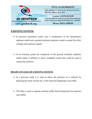 This document summarizes a review of behavior-based malware analysis for Android. It discusses existing stochastic epidemic models for malware detection that are complex. The proposed system abstracts program behaviors and compares them to reference malware behaviors to detect suspicious activities. It analyzes apps, represents them as trace languages abstracted according to behavior patterns, and detects malware by comparing to a malware database. The system gets installed apps, running tasks, extracts permission information, and detects malware to help users identify potentially malicious apps.