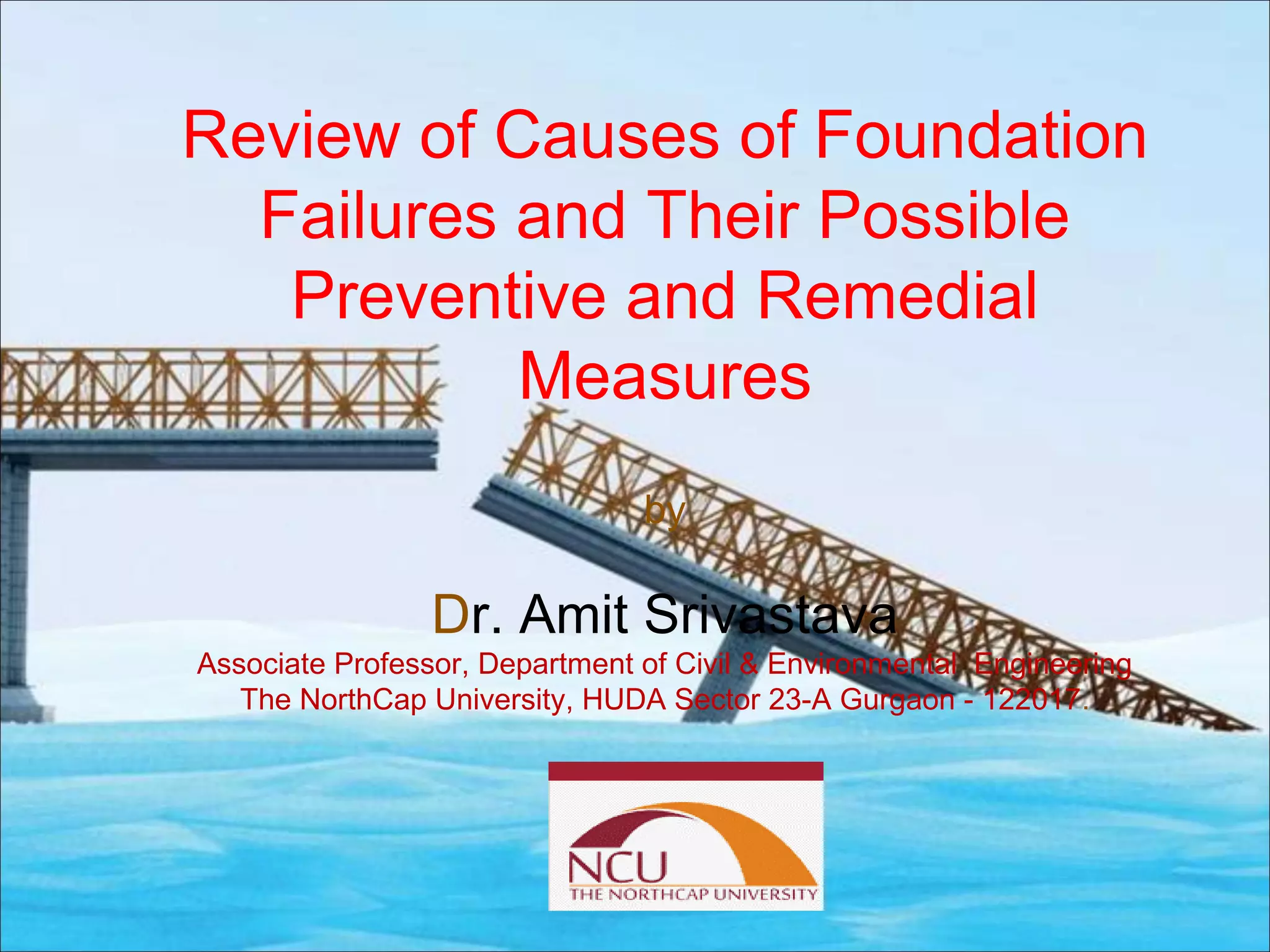 This document provides a review of common causes of foundation failures and possible preventative and remedial measures. It discusses 12 different causes of foundation failures including load transfer failures, drag down and heave in expansive soils, collapsible soils, lateral loads, construction errors, unequal support, water level fluctuations, earthquakes, vibrations, landslides, uplift, and concludes with recommendations. Preventative measures include soil improvement techniques, structural options like piles, quality assurance in mitigation, and construction controls. Remedies include underpinning, soil nailing, and preventing differential settlement.