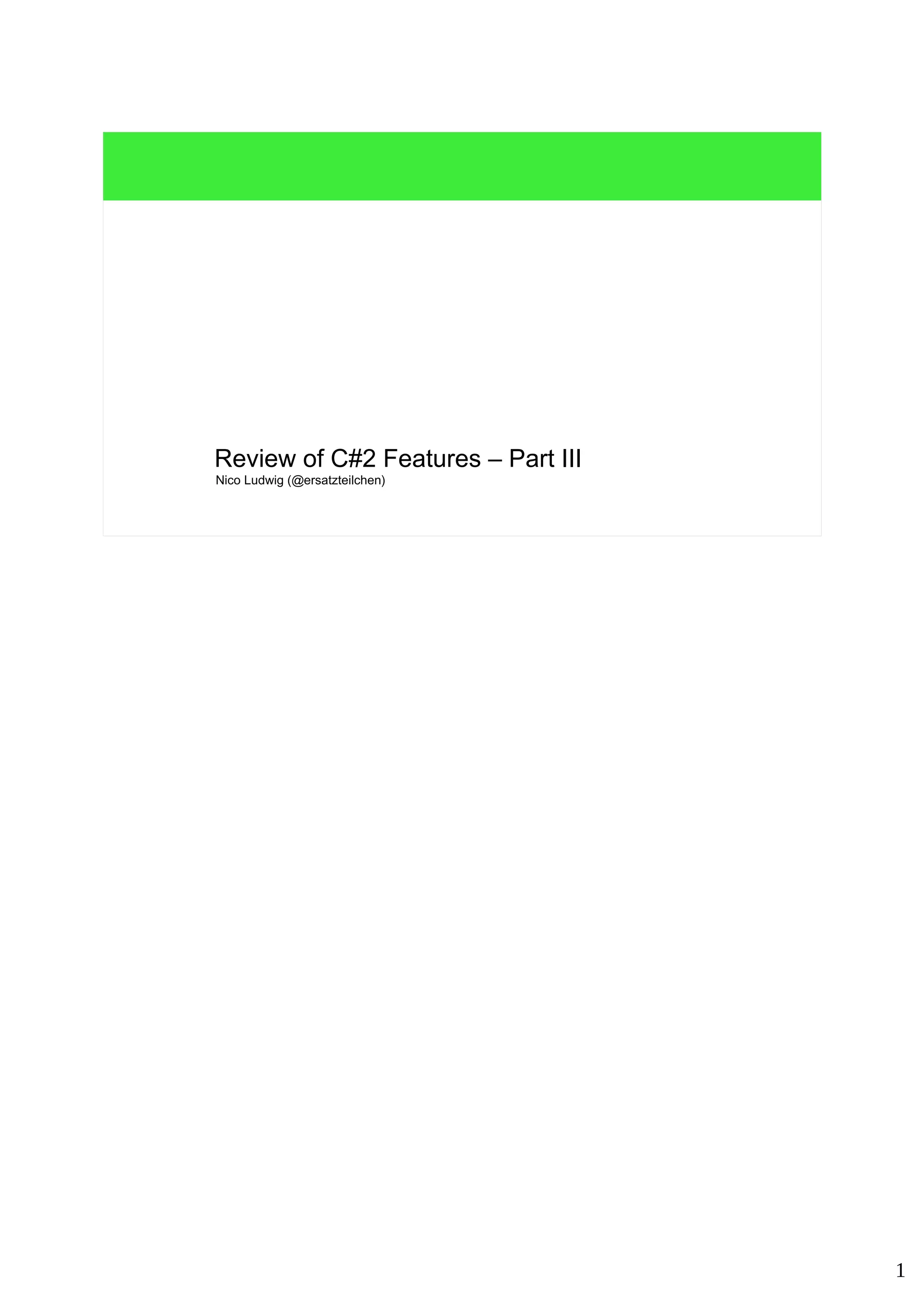 The document discusses new features in C#2 for iterators and nullable types. It describes how C#2 introduced iterator blocks using the "yield" keyword to more easily implement iterators. This allows iterators to be defined without having to implement interfaces. The document also explains how C#2 introduced the Nullable type to allow value types to represent null values. It can be used with the ? syntax sugar and supports lifting operators to work with nullable types.