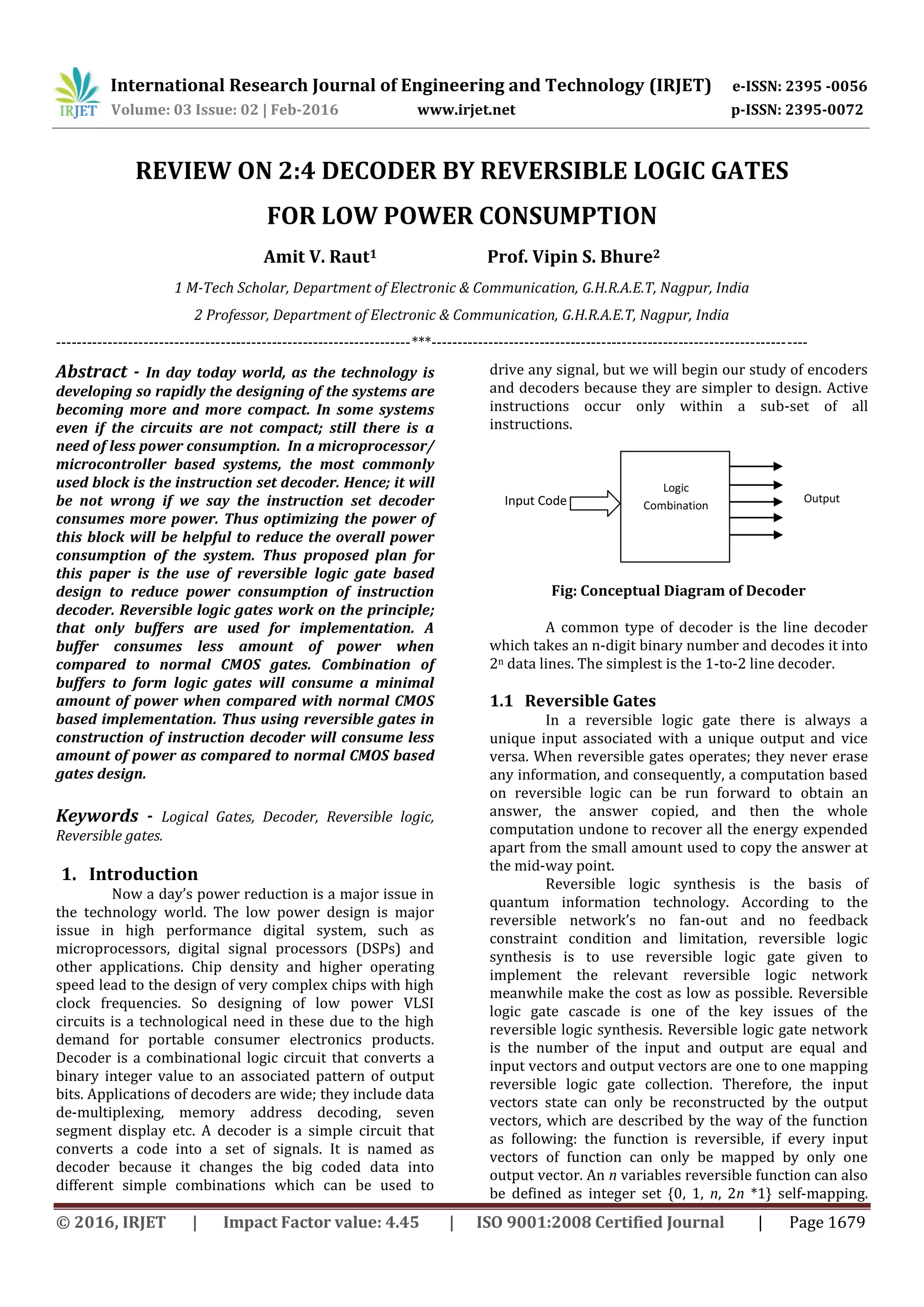 This document summarizes a research paper that proposes designing a 2:4 decoder using reversible logic gates to reduce power consumption. Reversible logic gates use minimal power by only employing buffers instead of traditional CMOS gates. The document provides background on reversible gates and decoders, reviews previous work on low-power decoder designs, and proposes a reversible gate-based 2:4 decoder design to reduce overall system power consumption compared to a standard CMOS implementation. Simulation results from other studies show reversible gate designs can achieve up to 26% power reduction for instruction decoding. The proposed design aims to lower delay and gate count while minimizing power.