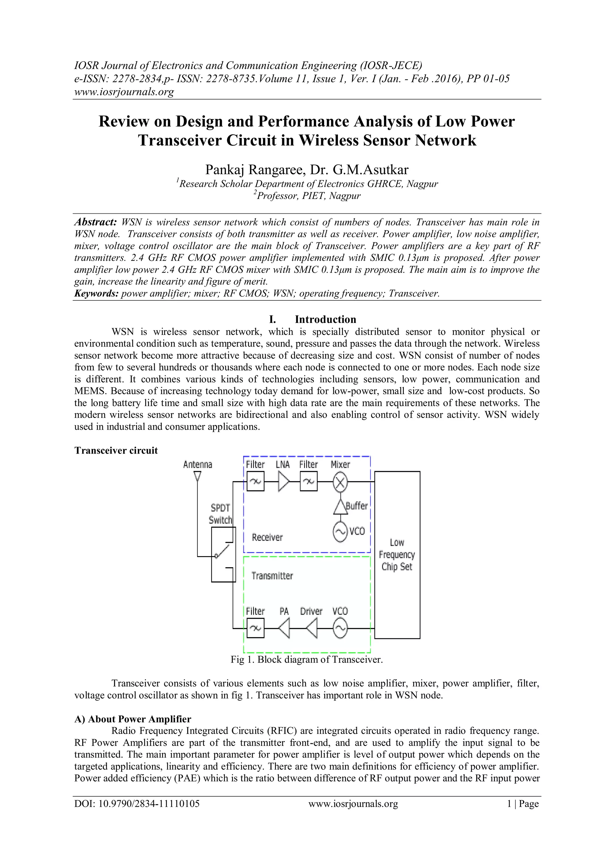 The document reviews the design and performance analysis of low power transceiver circuits in wireless sensor networks (WSN), focusing on components like power amplifiers and mixers. It highlights the importance of low power consumption, high data rate, and cost-effectiveness in modern WSN applications, along with various technologies such as CMOS and GaAs. The proposed methodology emphasizes the integration of power amplifier and mixer designs using CMOS technology to ensure efficient operation in the desired frequency range.